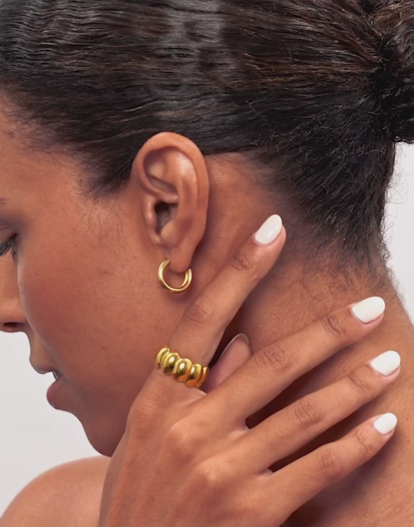 Our Bombé Bold Ring and Bold Hoops met, our Bombé Bold Hoops in 14k solid gold is what happened. A definite staple piece in your jewelry collection.