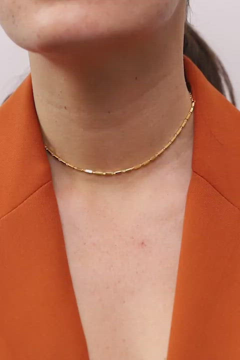 The Brick Choker draws from architectural precision, featuring interlocking rectangular links mimicking architectural brickwork that are sleek yet strong. Its structured design lies comfortably against the skin, offering both durability and elegance. The choker secures with a durable lobster clasp for effortless wear. This versatile piece brings structure to any outfit.