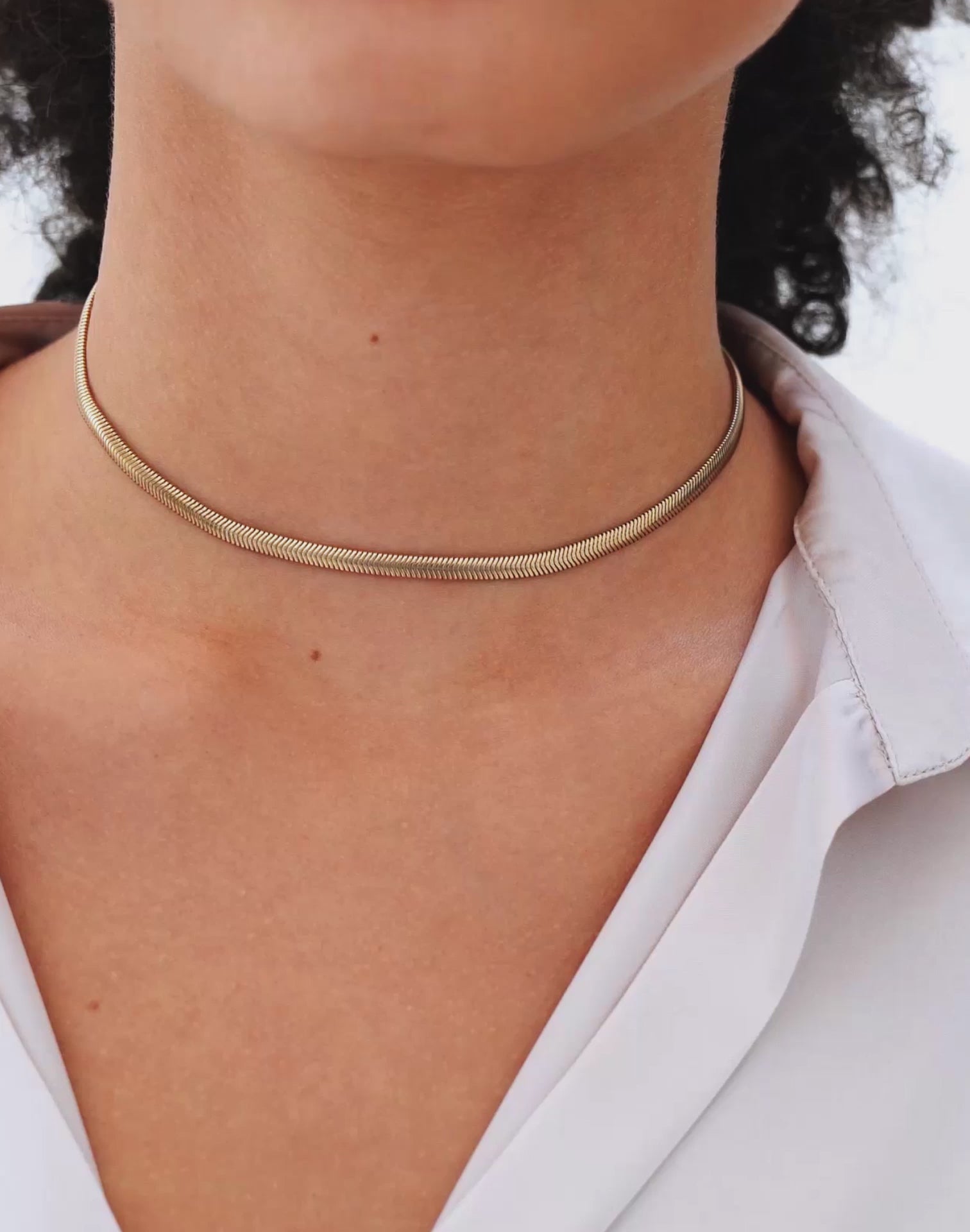The Herringbone Chain Choker is meticulously crafted—each link assembled with precision to preserve its fluid drape and soft movement. Created for flow and finesse—wear it alone for impact or stack it for depth. Moves with you, from first light to late night.