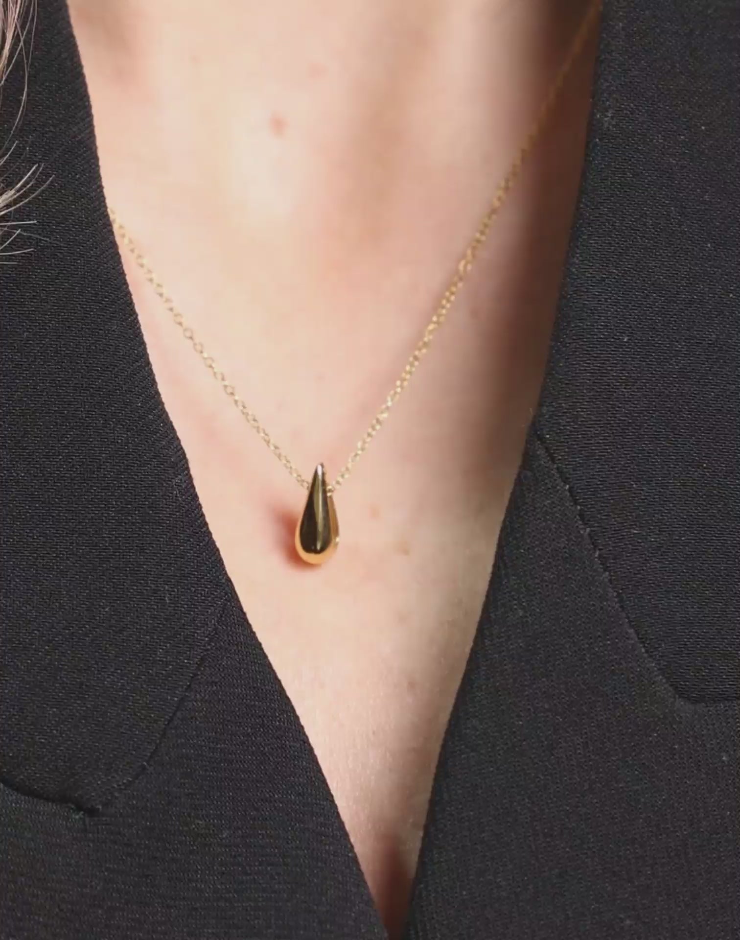 The Mini Drop Pendant features a subtle dent in the design, representing the impact of experiences, making each piece a unique symbol of personal growth.