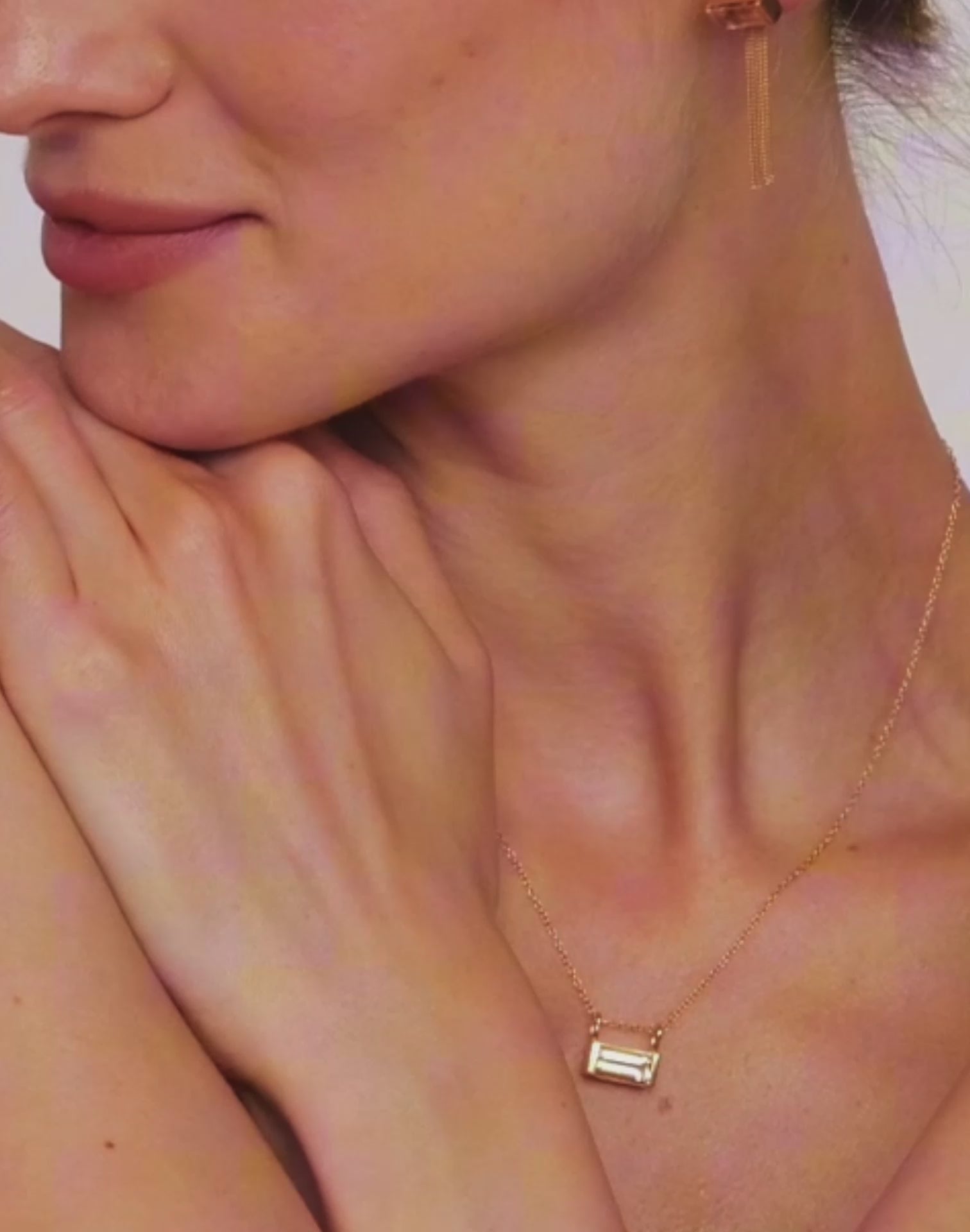 Ein kantiger Baguette-Stein, gefasst in feine Geometrie. Lässt sich mühelos an jede feine Kette anbringen.