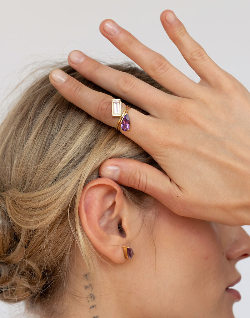 Mimicking a drop of liquid metal solidified into a delicate organic shape with a vibrant stone at its core. The Stone Fluid Necklace features a fairly sourced Aquamarine stone. This necklace brings a subtle yet vibrant pop of color to your outfit, perfect for elevating any look.