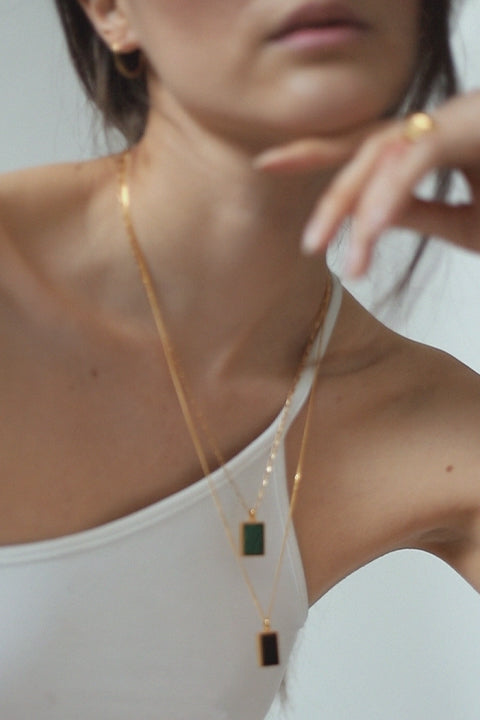 If you are looking for a statement piece with a deeper meaning the Indefinable Tag Pendant is your pendant. It comes with three healing stone options. While Onyx is dark, helps protect against evil, and promotes self-love, the distinctive and trendy green Malachite gem is one that helps remove impurities. Goodbye, negative energy. White Chalcedony, in turn, is called the stone of harmony and believed to be a great confidence booster and to help create balance in your life. All stones are fairly sourced in Brazil and cut in Germany.